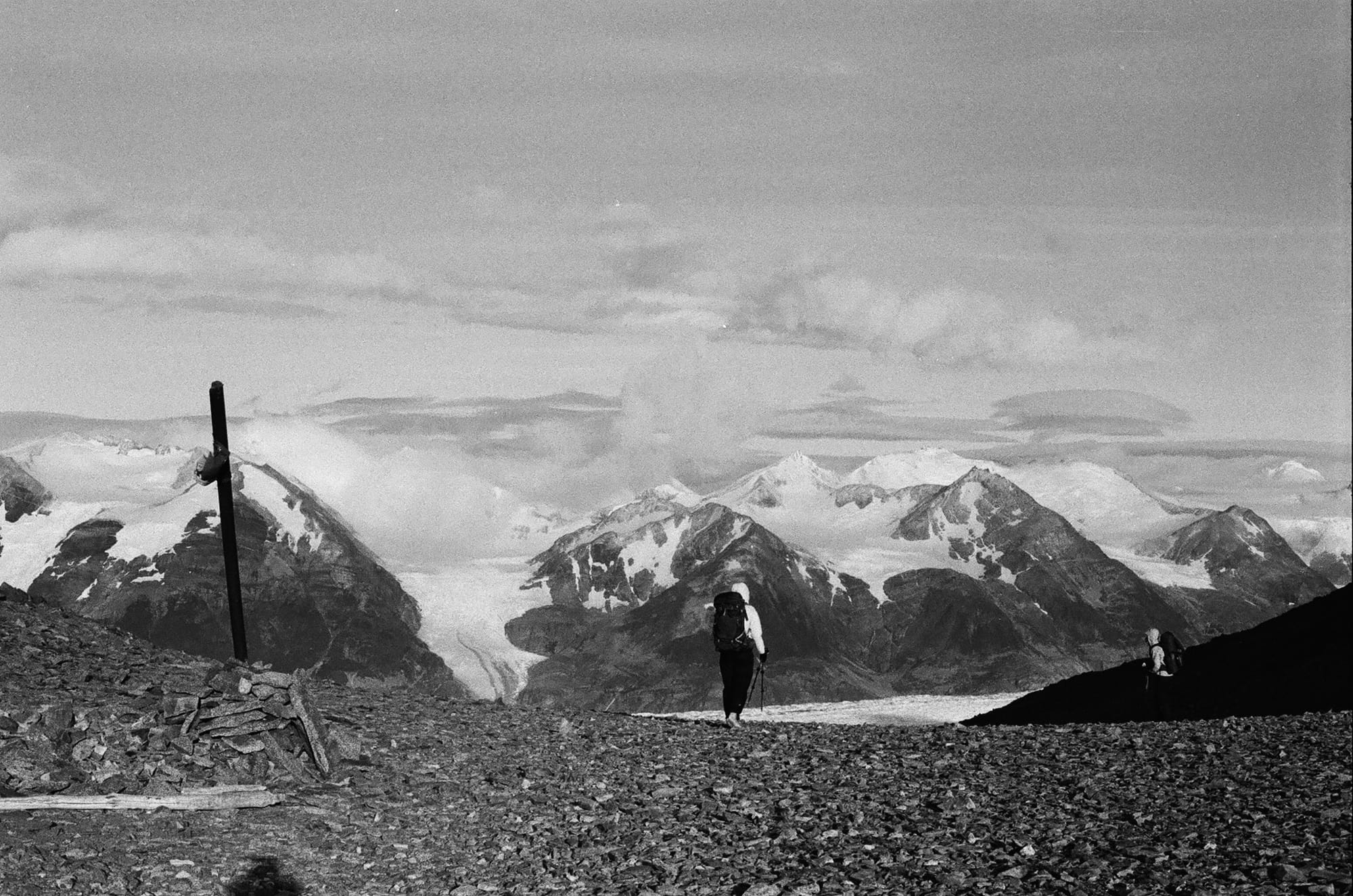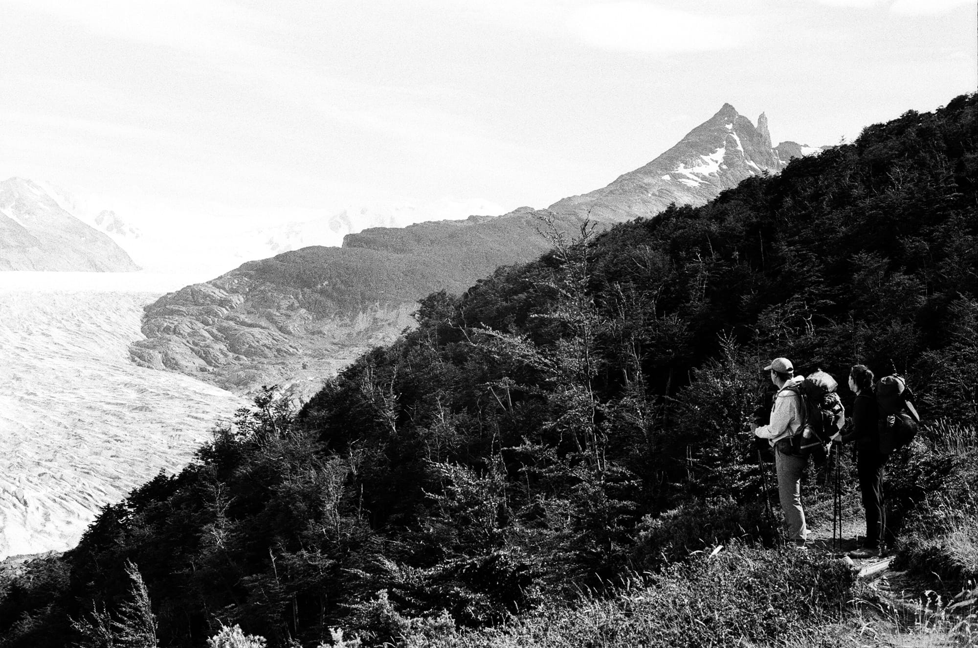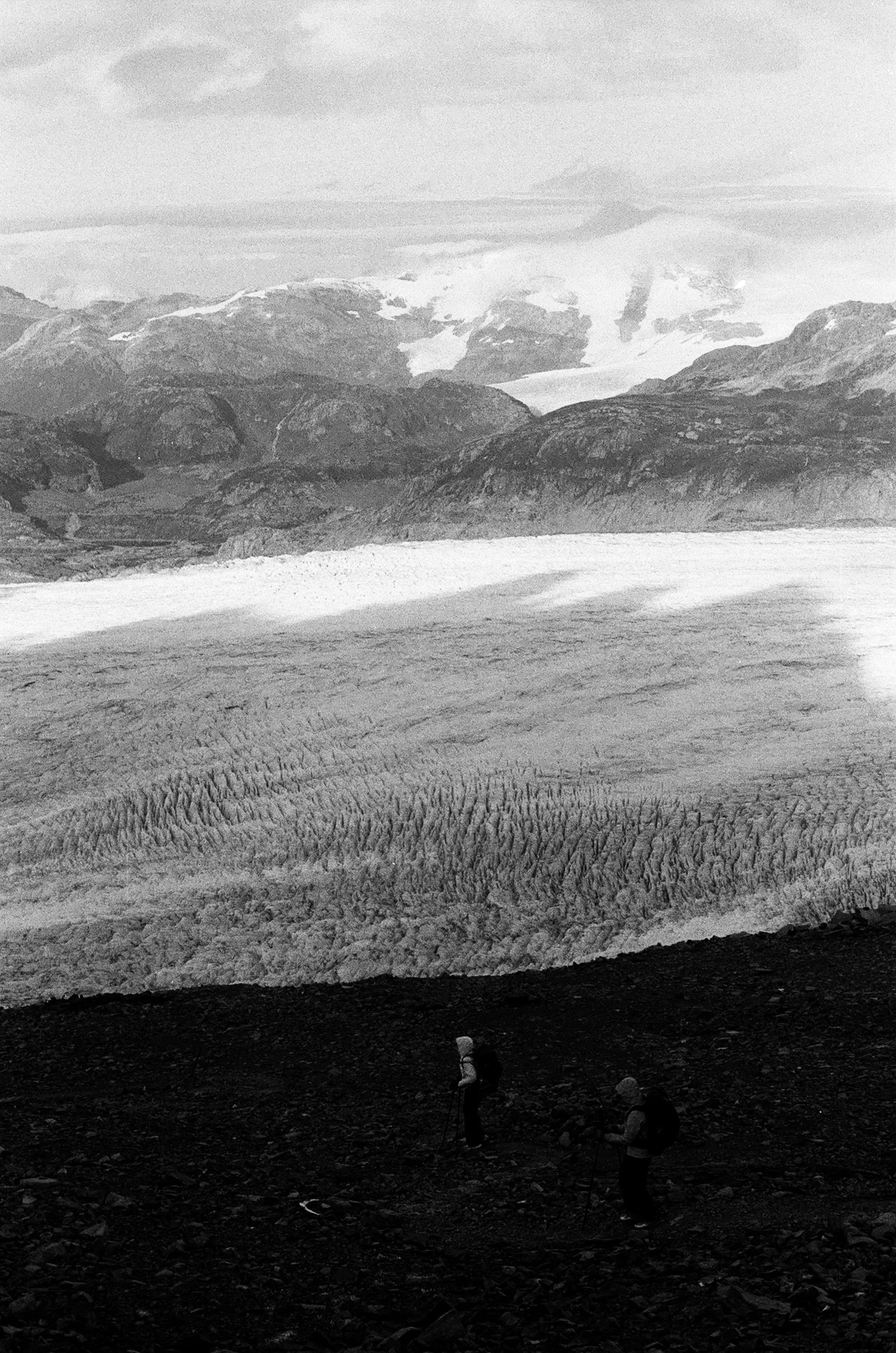 Luckily, the tent splint seemed to be doing its job as we woke up in an intact tent. Our third day was shorter, about 8 miles, but the forecast was a bit grim. We had a climb west out of the valley and the first 6 miles or so were reasonably protected in forest. However, as we exited the trees and continued our ascent, our last 2 miles were very exposed and we were pelted by rain, hail, and wind. This was our first chance at a close glimpse of Glacier Perros as it seemed to melt into a turquoise pool. We entered into Los Perros campground cold and wet, and unfortunately would stay that way for the rest of the night as there were no showers or much shelter here. It was a cold night and we were a bit nervous for tomorrow, which would be the hardest and most technical day over John Gardner pass. But, the weather forecast from the rangers sounded promising though this was hard to believe as we fell asleep to the soothing sound of hail on our tent roof…