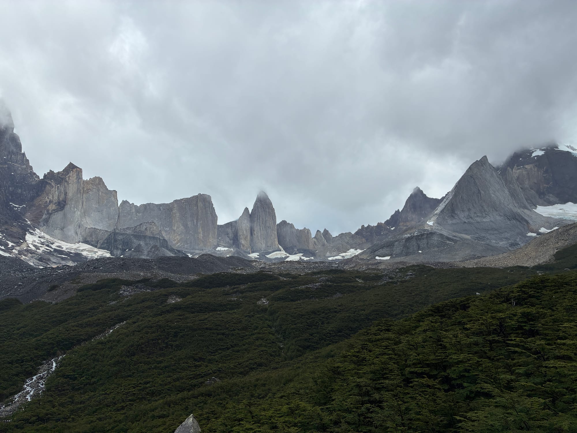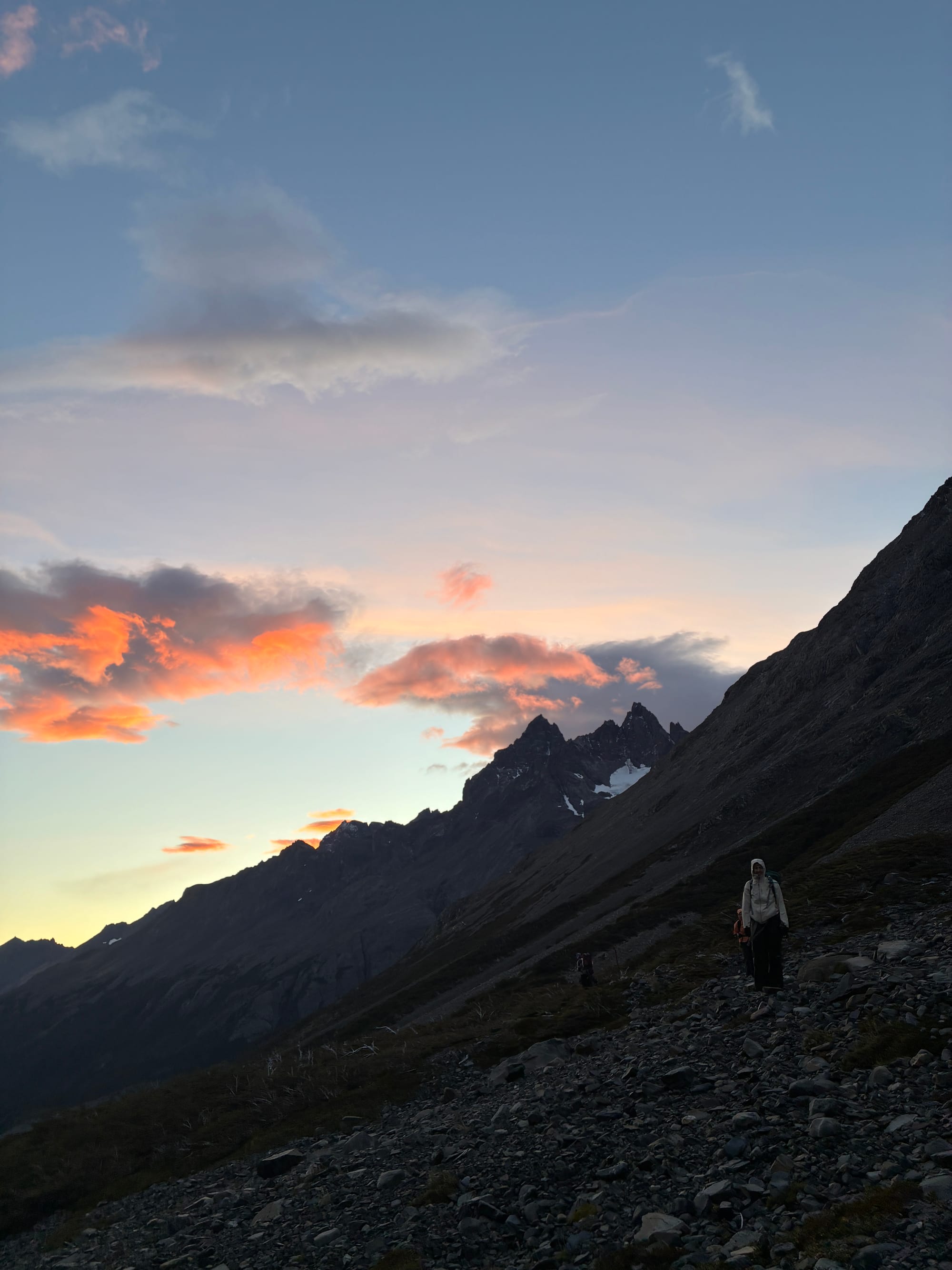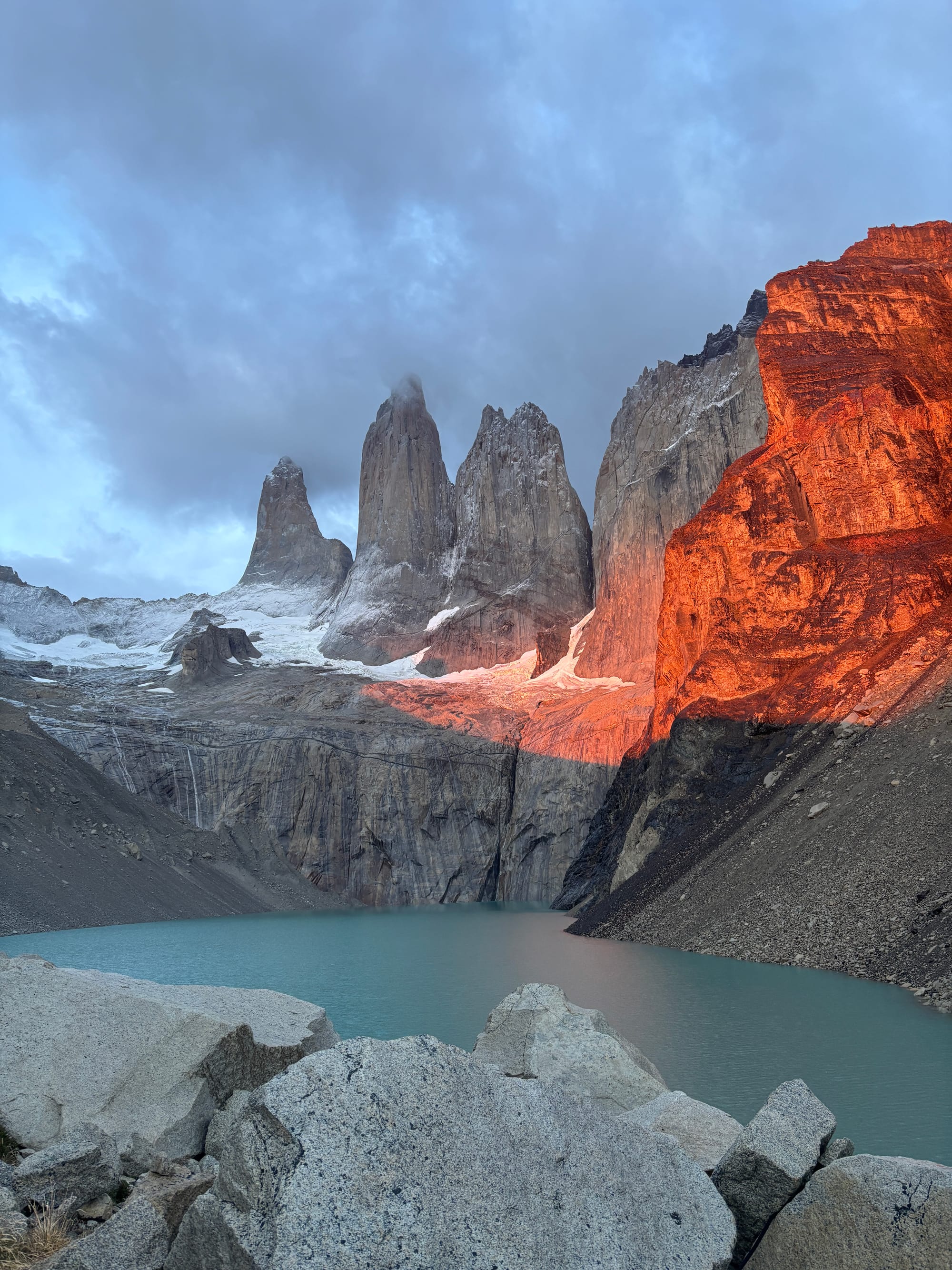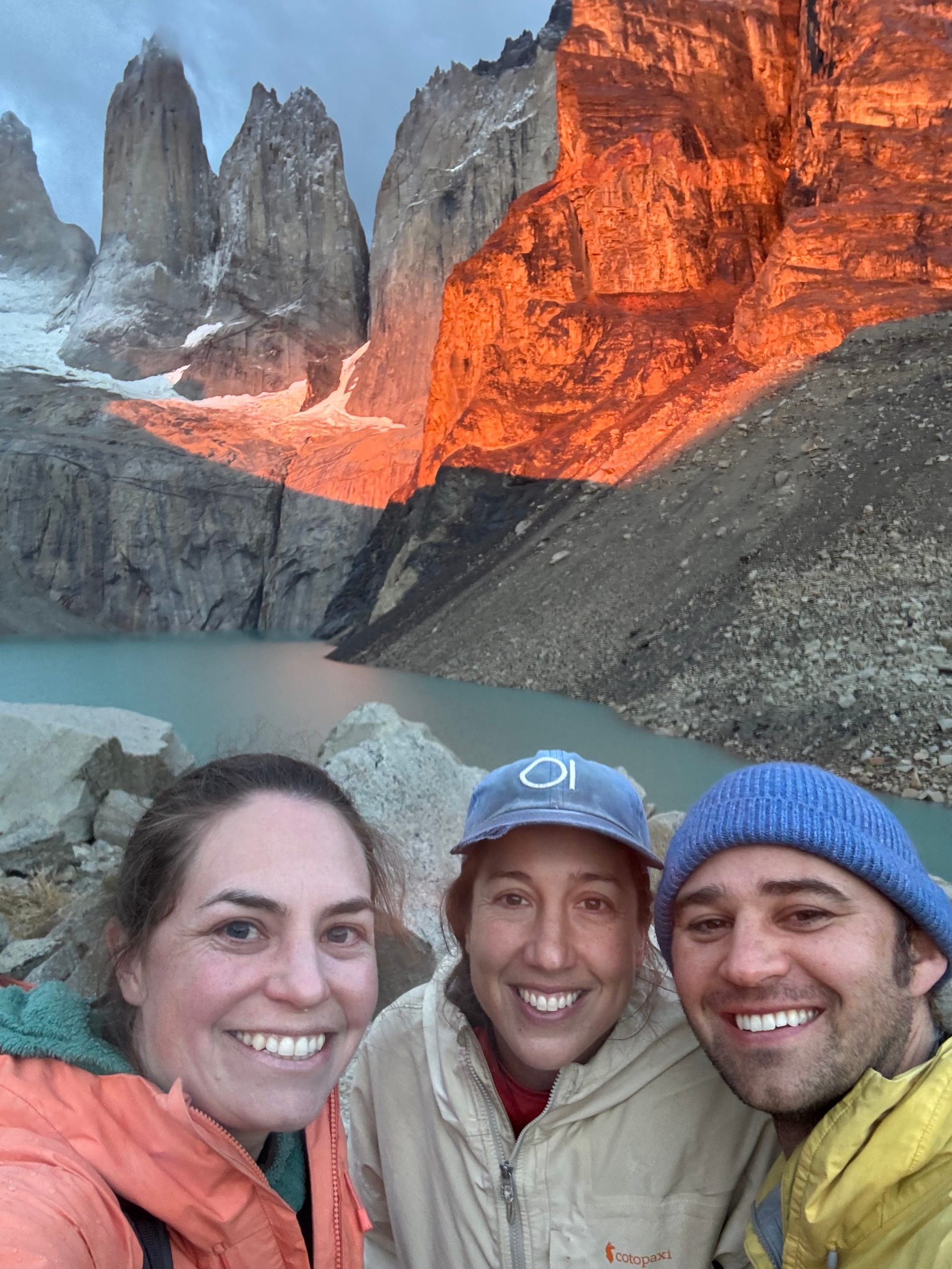 We were up at 4:30 and had camp broken down by 5:00 am. We were shocked to find Alyssa already drinking coffee at a picnic table! She walked with a fellow American O-trekker and felt better about not being Puma bait with his company. We put in about 2.5 headlamp miles in the rain (again, they feel like nothing) and the terrain turned alpine, steep, and exposed with about 3/4 of a mile to the top. When we got to the top at Lago Torres, the Towers were socked in with fog and a cold sleet and wind was hammering us. We had about 15 minutes to sunrise so Alyssa climbed into a cave and we huddled against a huge boulder waiting. Sunrise was officially at 7:14, at 7:05 Em said, “I think we should call it,” but gently accepted a compromise of at least waiting until sunrise. And a small miracle happened then, for the clouds and fog lifted, the rain stopped, patches of blue sky appeared, and Las Torres was illuminated in a bright orange glow. It was shocking and very unexpected. The weather held for about a half hour before the wind and rain started again so that was our cue to begin the long and final march down to the base, but spirits were high with a great mirador and we finished the entire hike at the visitor center, closing the 75-mile loop. It was really fun to watch the trickle of fellow O-trekkers cross the finish line and we had a group lunch with maybe 20 of us sharing burgers and beers at the visitor center.