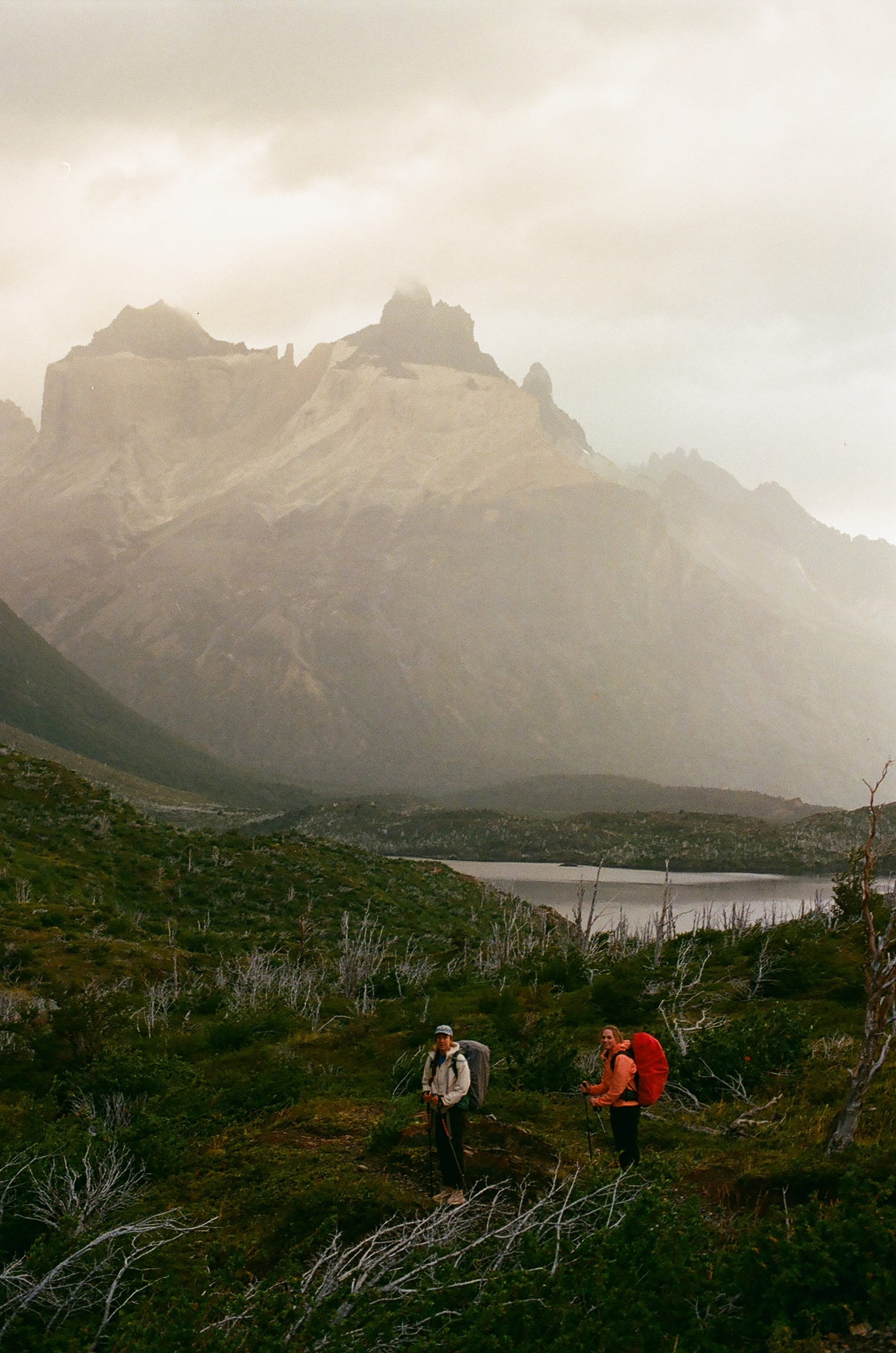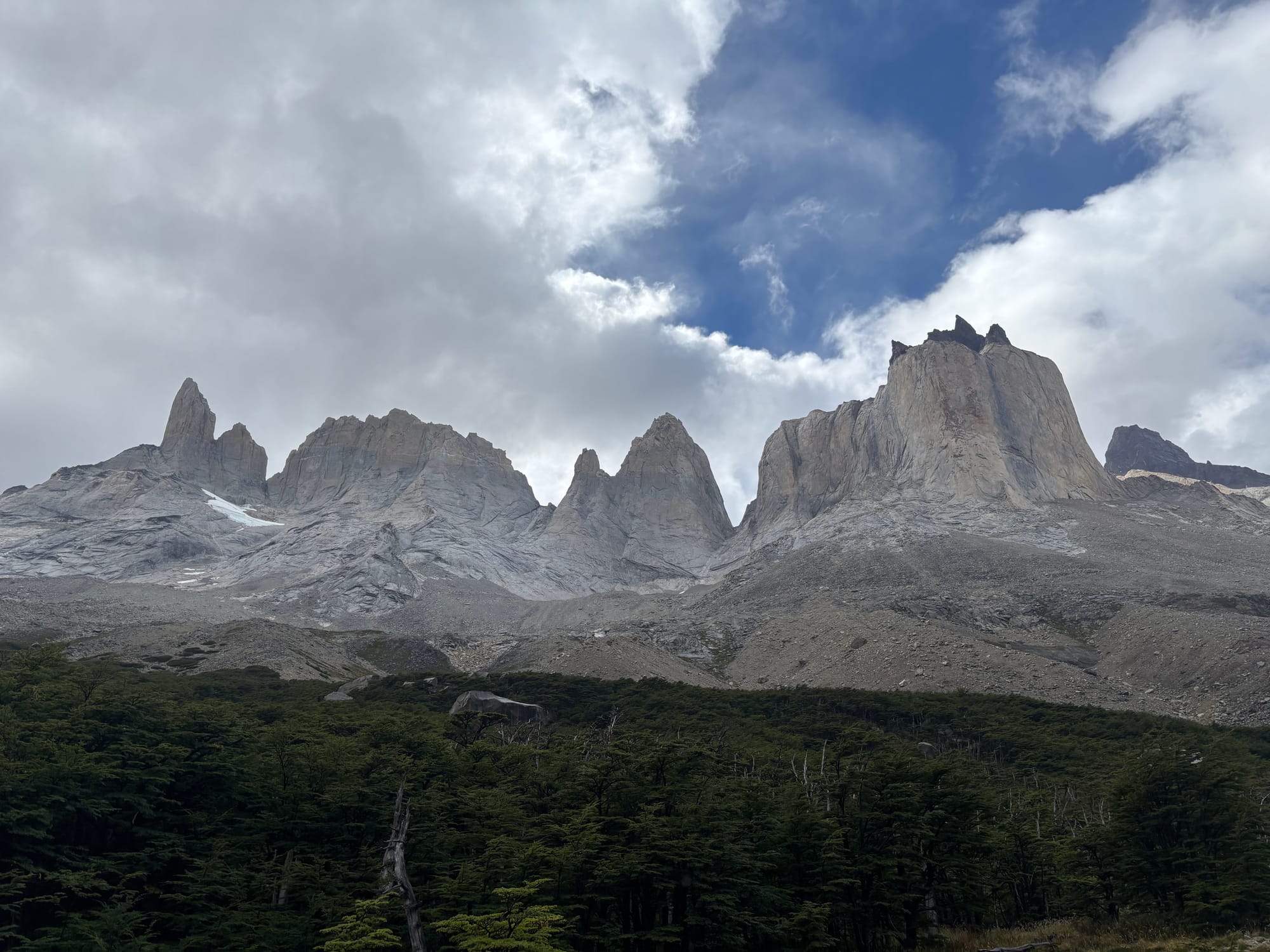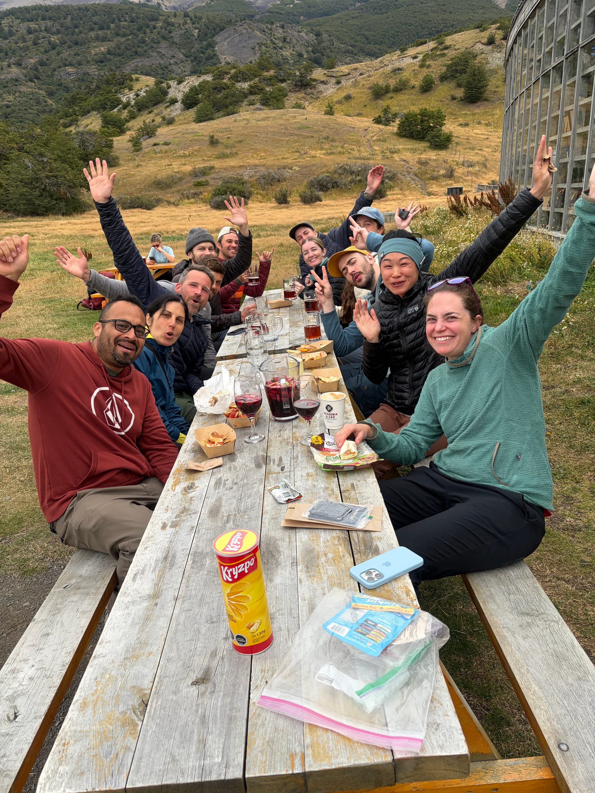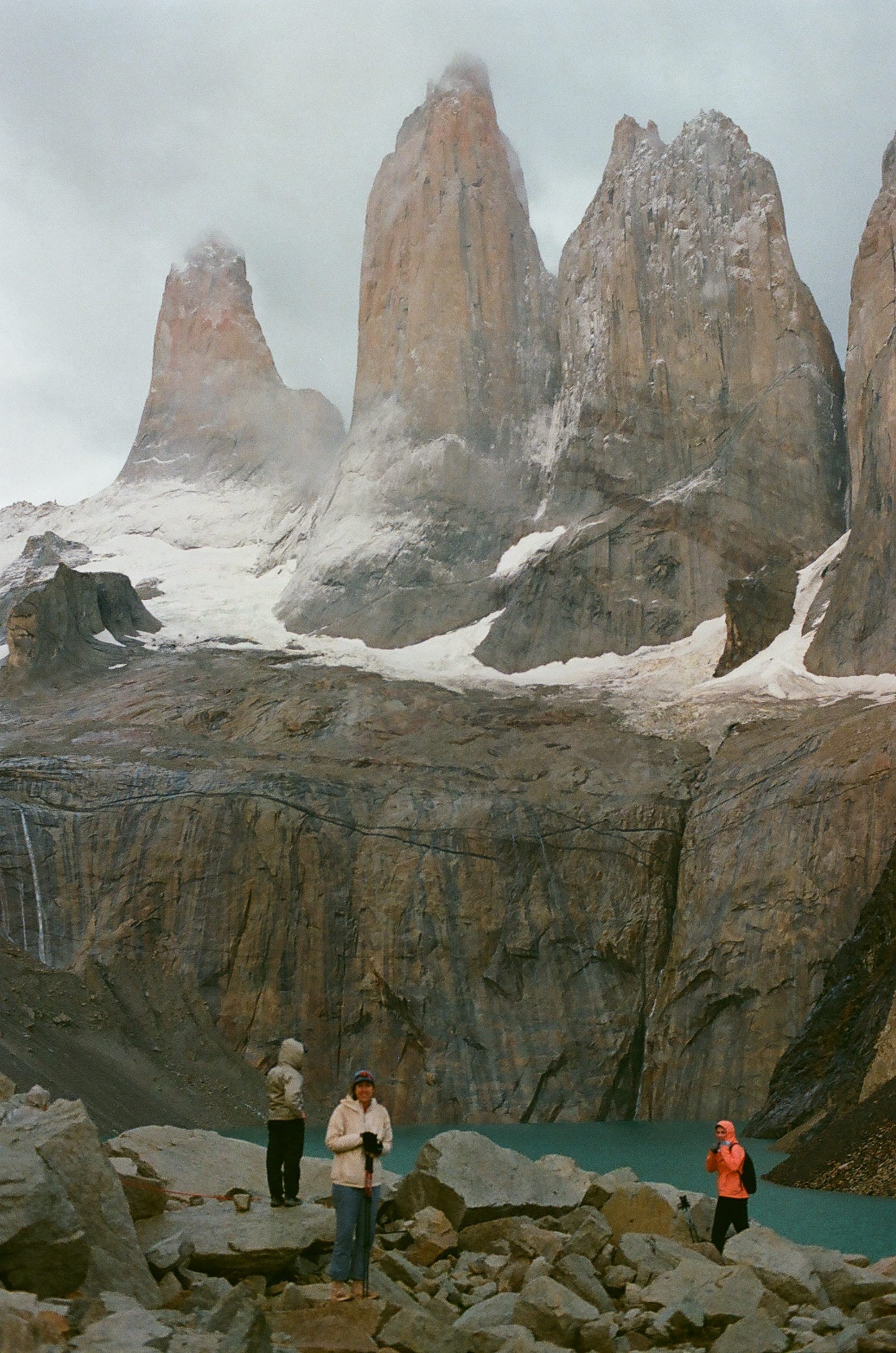 We were up at 4:30 and had camp broken down by 5:00 am. We were shocked to find Alyssa already drinking coffee at a picnic table! She walked with a fellow American O-trekker and felt better about not being Puma bait with his company. We put in about 2.5 headlamp miles in the rain (again, they feel like nothing) and the terrain turned alpine, steep, and exposed with about 3/4 of a mile to the top. When we got to the top at Lago Torres, the Towers were socked in with fog and a cold sleet and wind was hammering us. We had about 15 minutes to sunrise so Alyssa climbed into a cave and we huddled against a huge boulder waiting. Sunrise was officially at 7:14, at 7:05 Em said, “I think we should call it,” but gently accepted a compromise of at least waiting until sunrise. And a small miracle happened then, for the clouds and fog lifted, the rain stopped, patches of blue sky appeared, and Las Torres was illuminated in a bright orange glow. It was shocking and very unexpected. The weather held for about a half hour before the wind and rain started again so that was our cue to begin the long and final march down to the base, but spirits were high with a great mirador and we finished the entire hike at the visitor center, closing the 75-mile loop. It was really fun to watch the trickle of fellow O-trekkers cross the finish line and we had a group lunch with maybe 20 of us sharing burgers and beers at the visitor center.