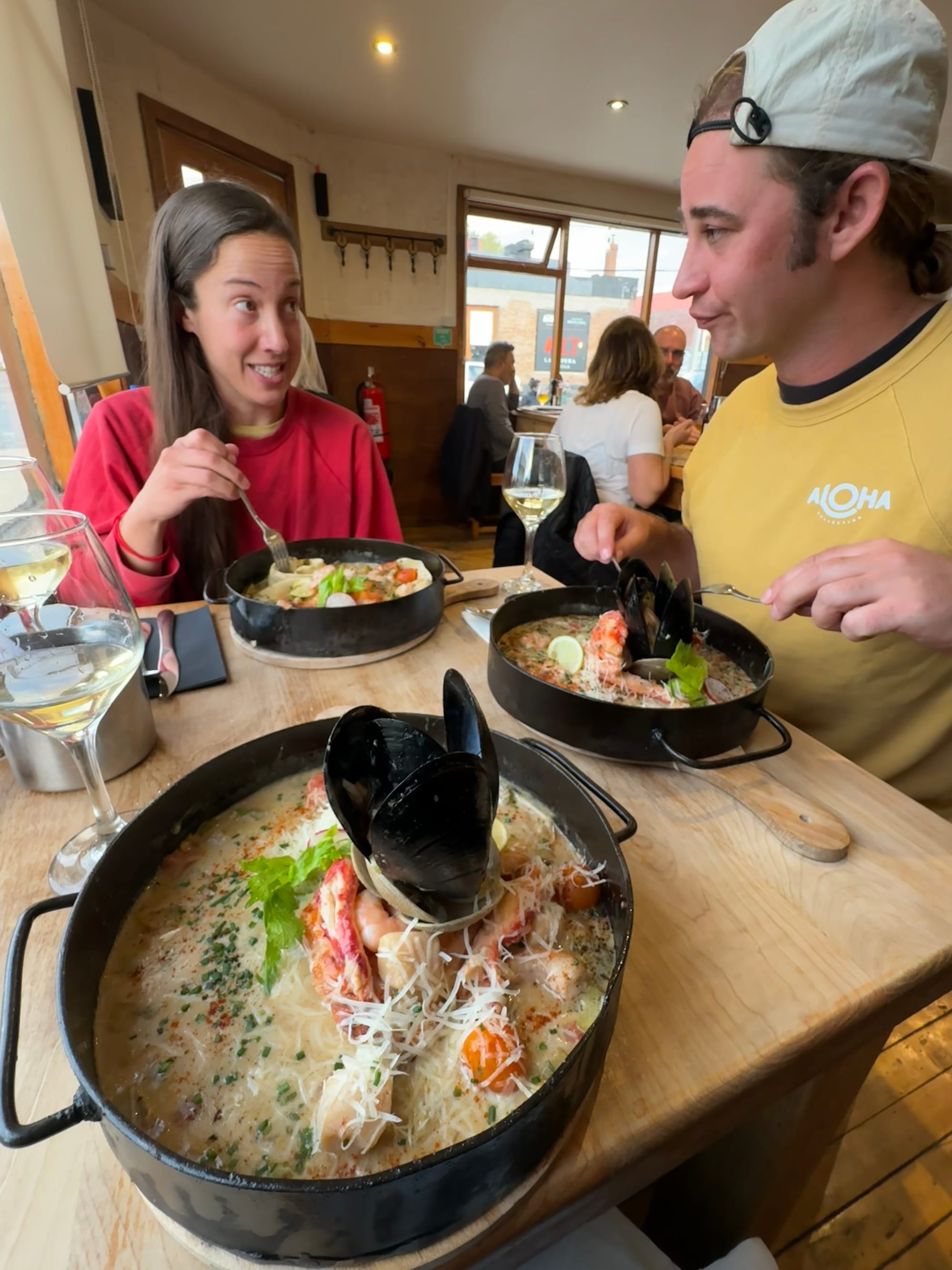 In retrospect, it’s not lost on us that it sounds like we had quite the posh hike, and that is true. Even though we carried all of our meals and tent and gear, the fact that we were able to enjoy some creature comforts on most days made things much easier. But, these were serious miles and elevation gain and we were happy to have a couple of rest days in our near future. When we were in Puerto Natales before the O-trek, we had scoped out possible restaurants for our post-trek celebratory meal and we landed on La Disqueria. Literally, it just sold giant disks of seafood. There is nothing that we crave more than the completely impossible or unobtainable while in the backcountry and the most out of reach food of them all is seafood pasta. So as you can imagine, this was a special meal. We sadly bid farewell to Alyssa who made her journey back to Minneapolis from Puerto Natales as we started our slow journey North to our next stop at El Chalten.