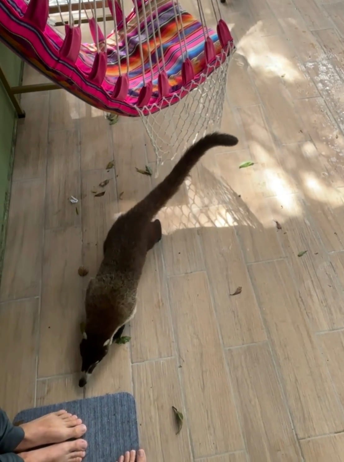 A curious coati visits us on the treehouse porch