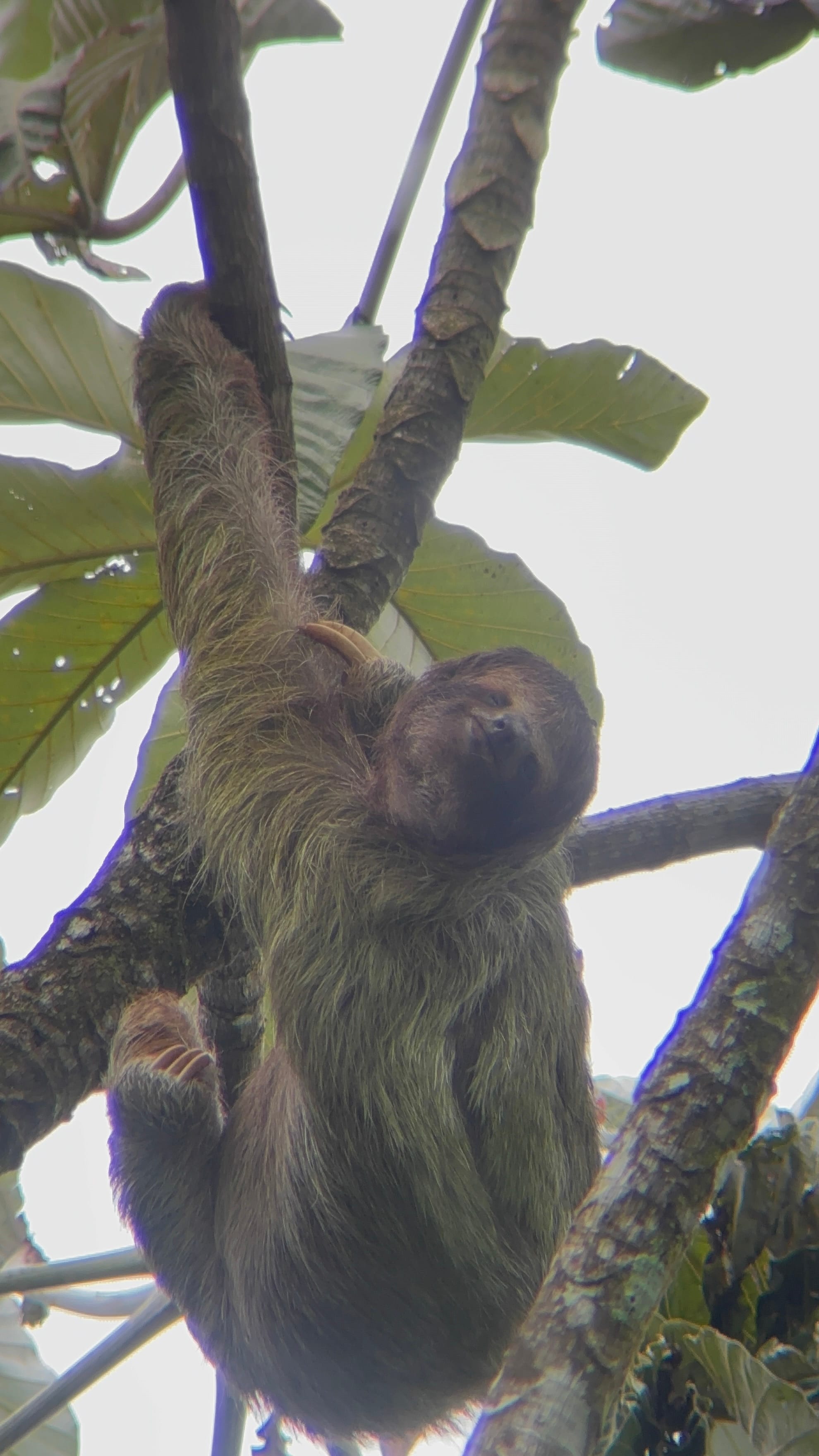 We had not spotted any sloths in Valle Azul so we decided that we should enlist another guide to help with this. So, we had an early morning drive north and looped through the Monteverde Cloud Forest to La Fortuna. Our tour guide was a Tico who grew up in the forest and almost immediately spotted our first sloth. It looked identical to the dark clumps of dead leaves surrounding it until we looked through his monocular scope- it was indeed our first sloth! In that reserve, there were two types of sloth, 3-toed and 2-toed. We saw both types that day in addition to more toucans. All of the sloths were slumbering in what appeared to be impossible sleeping positions (we found out their odd head positions are due to 2 extra cervical vertebrae compared to humans) but finally our last sloth, a female 3-toed, gave us a good show of scratching, eating, and climbing. When she looked at us with the eternal sloth smile, Em melted into a puddle.