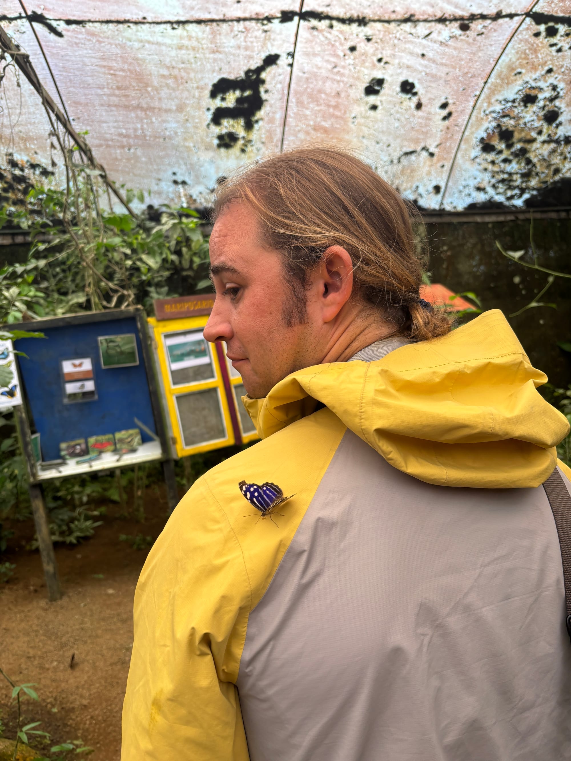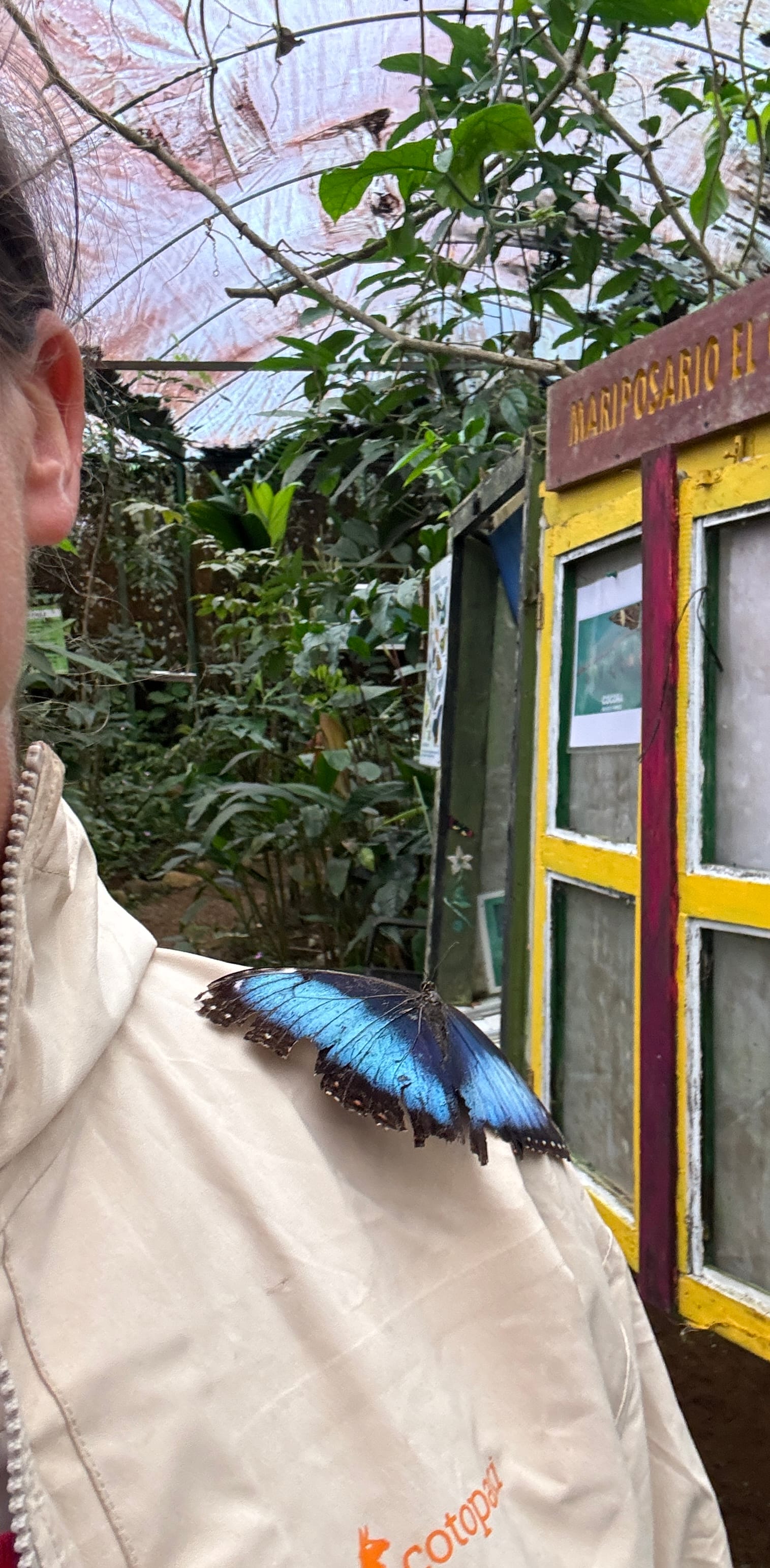 Butterflies at the sanctuary, the Blue Morpho Butterfly on the right