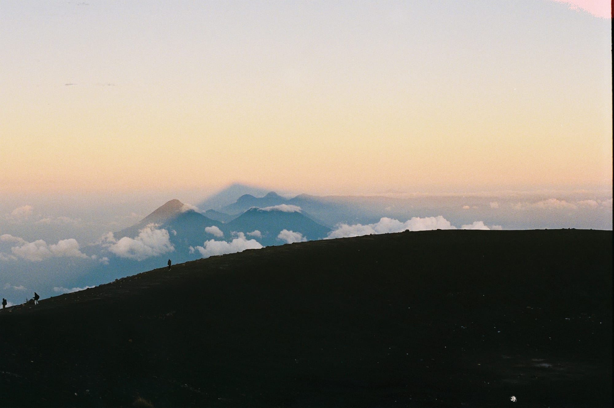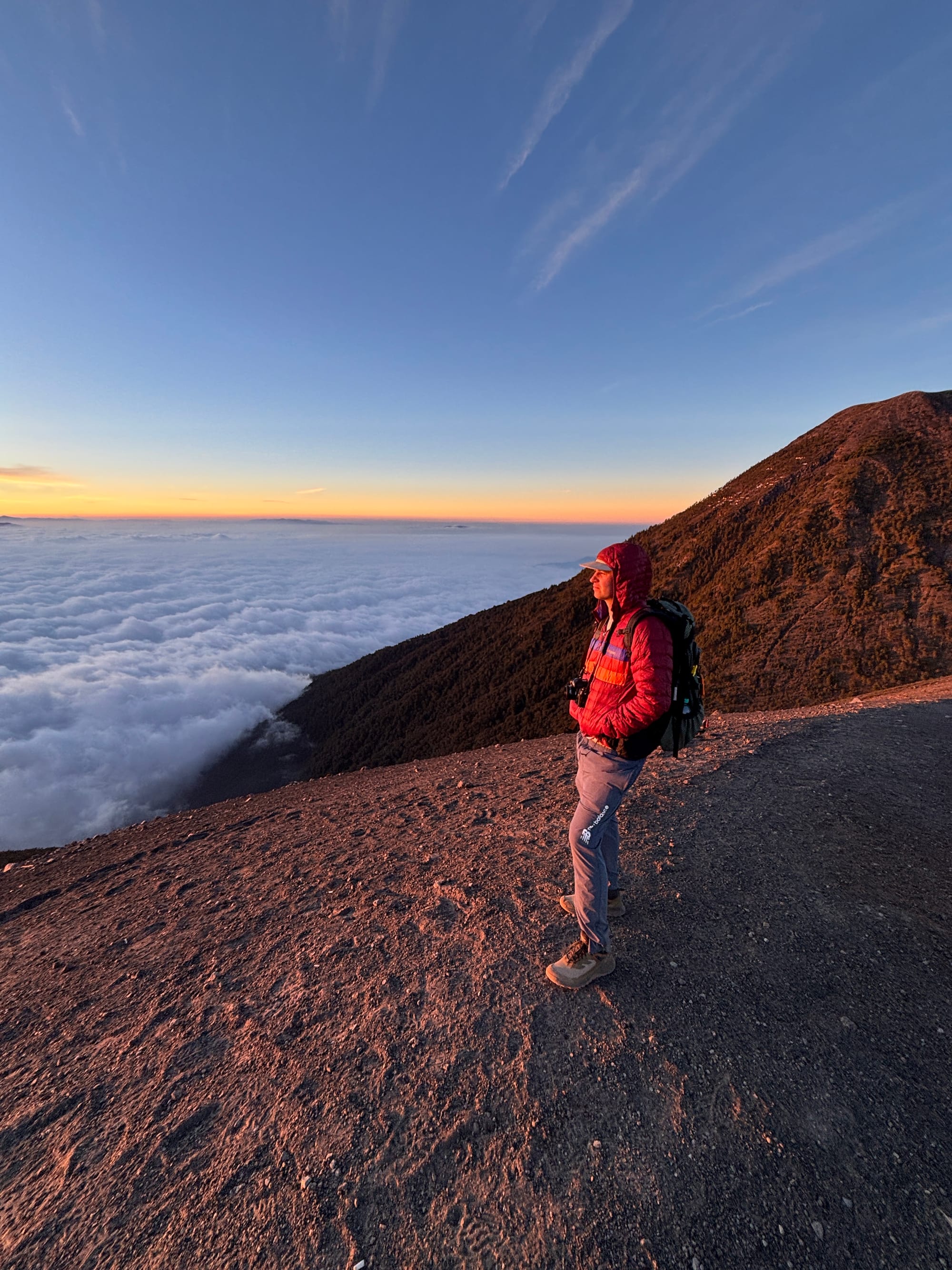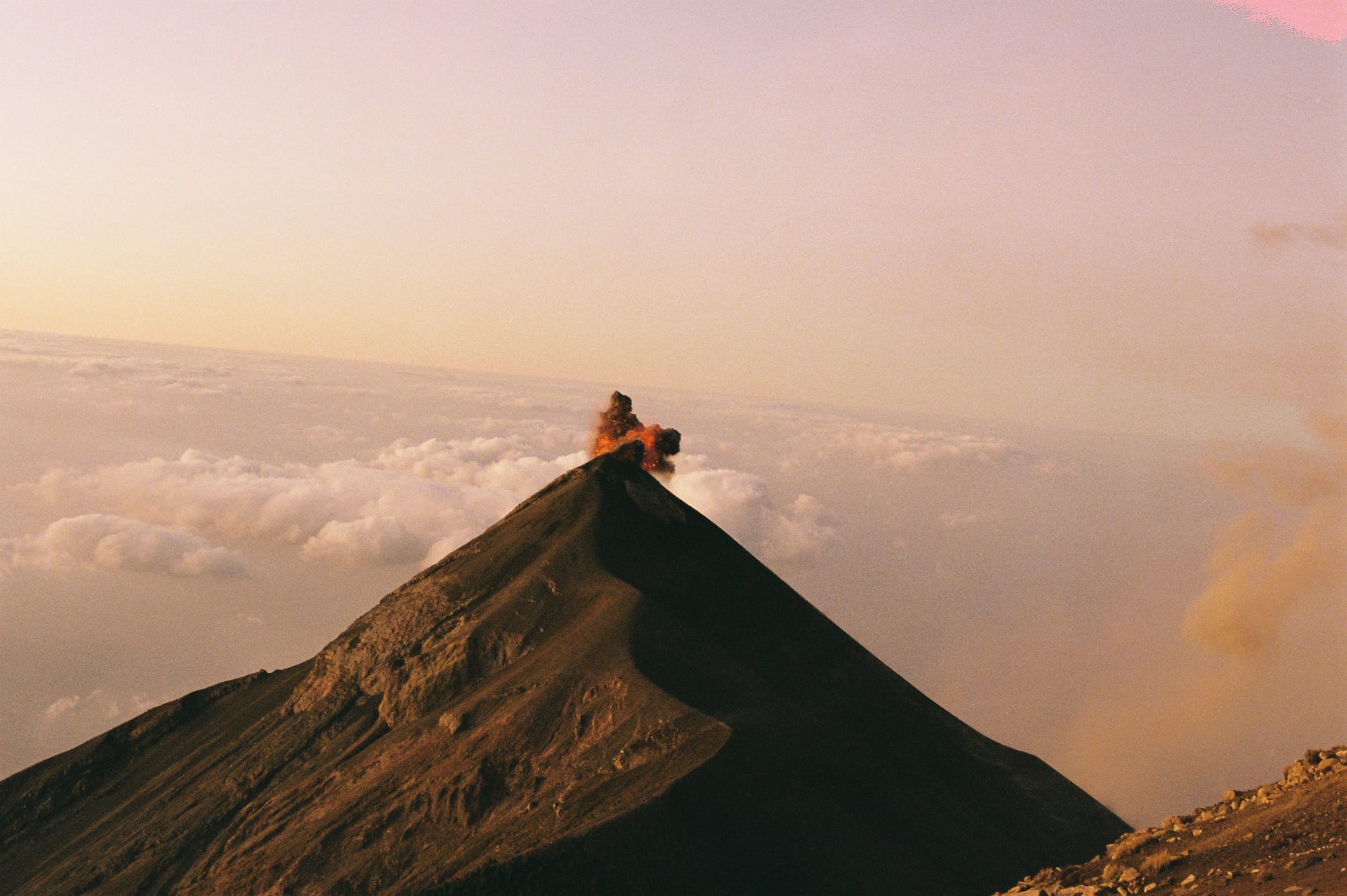 We had a 2 hour break before we began the 1000 foot descent down to the base of Fuego and another 1000 foot ascent to the saddle where there was “The Limit” of Fuego at which point you couldn’t pass due to the risk of being sprayed by lava. We got to The Limit about 30 minutes before sunset. Just as we crested the saddle, one of the biggest explosions of the night suddenly erupted and we paused in shock. Car-sized molten lava boulders careened into the air and tumbled down the side of Fuego. It went against all of our instincts to continue walking on, but the spectacle of it all was worth it. As night descended, the eruptions got more and more impressive and other-worldly. To the west we could see all the way to Lake Atitlan and the seven volcanoes surrounding the lake, but between us and Lake Atitlan was a carpet of clouds. Had we not known better, we would have thought an ocean separated us from the distant volcanoes. In the dark, we strapped on our headlamps and hiked the steep, sandy descent from Fuego and back up to Acatenango base camp.
