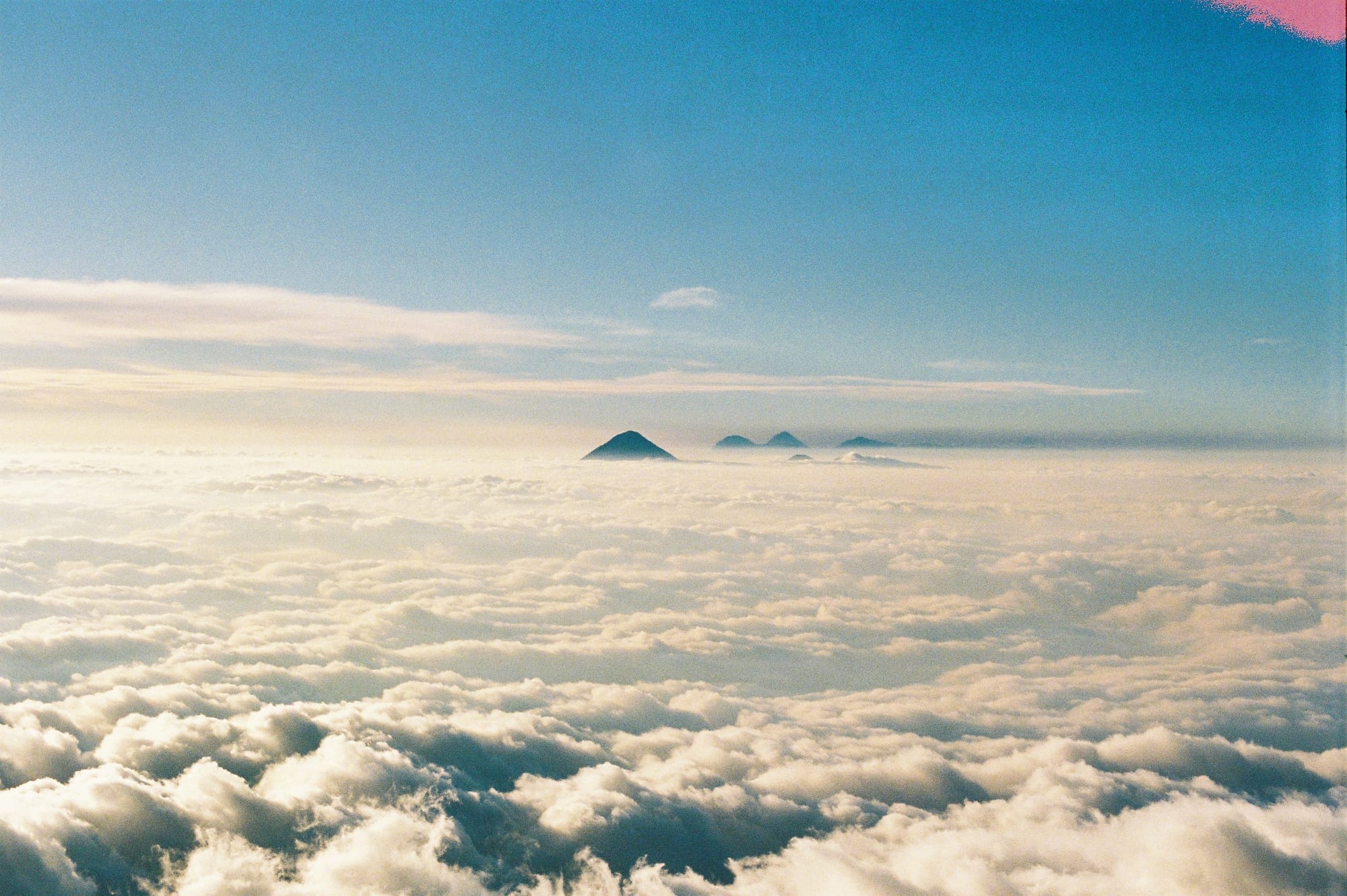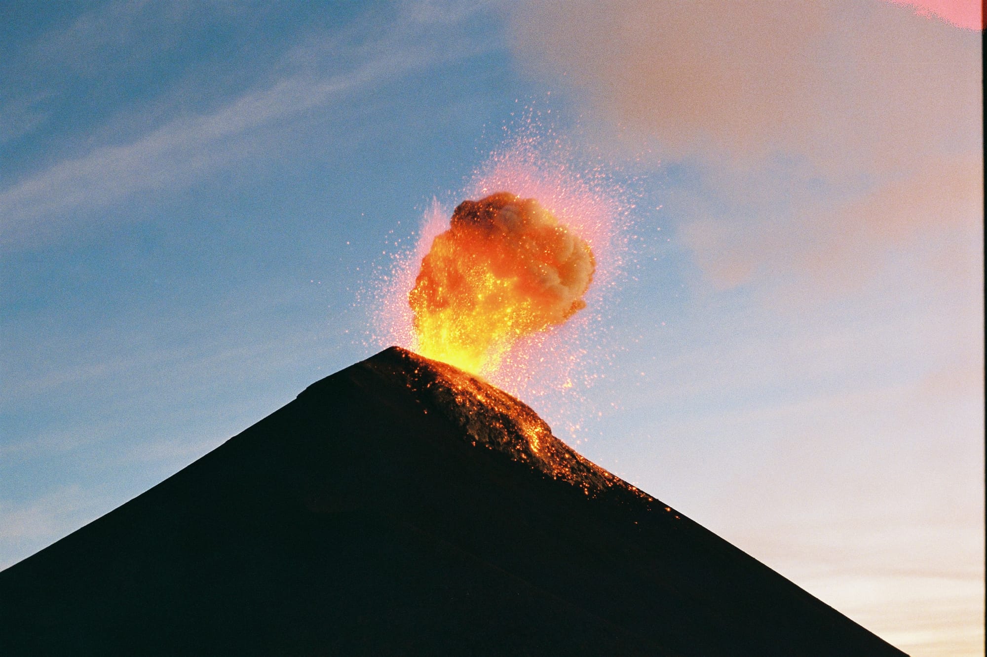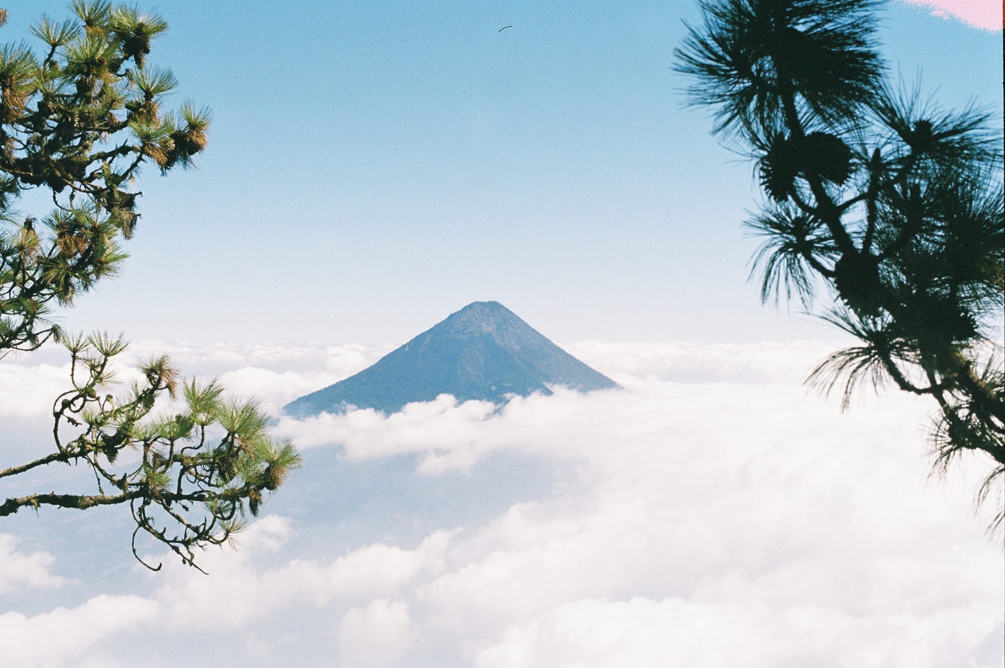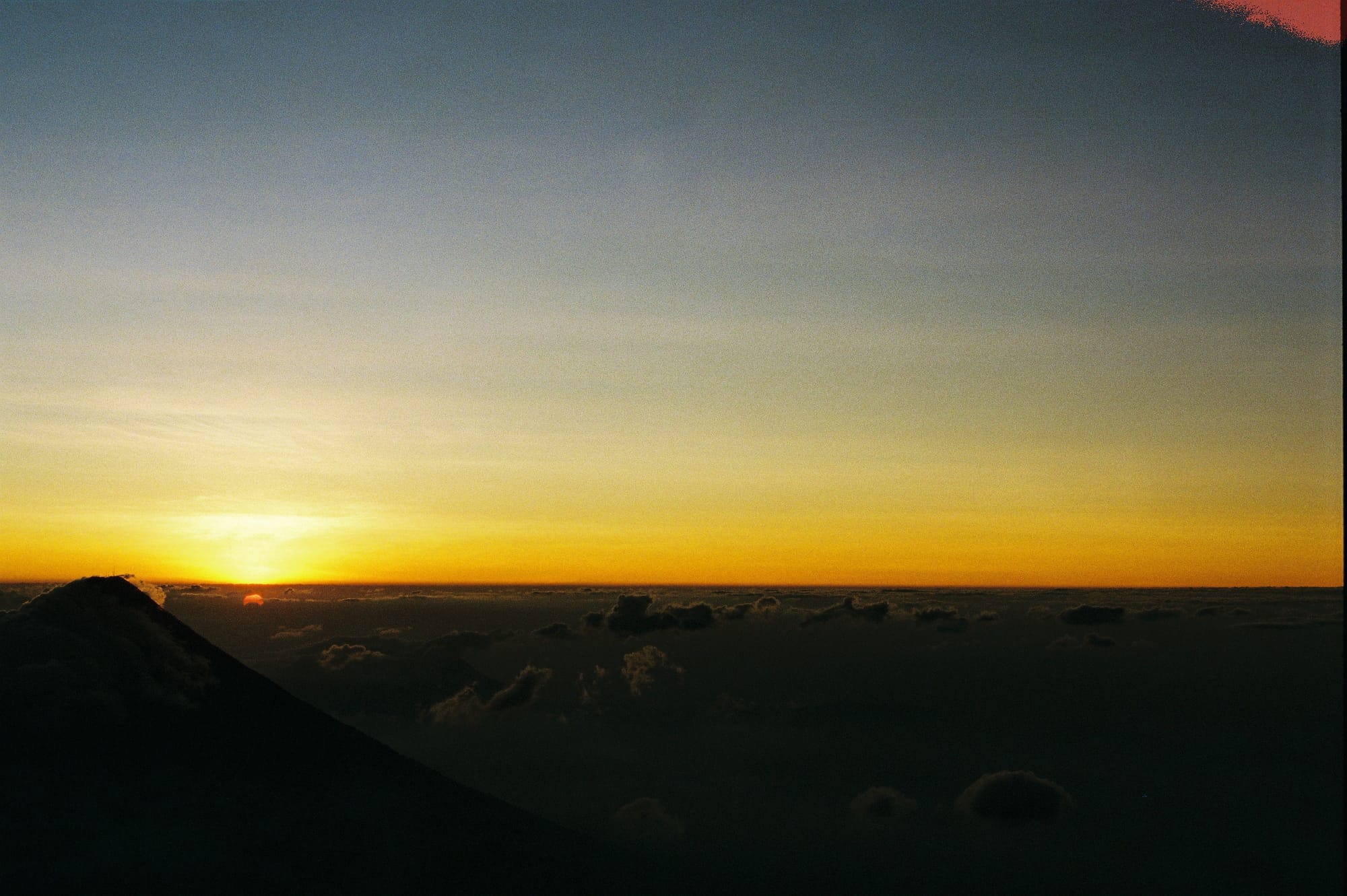 We had a 2 hour break before we began the 1000 foot descent down to the base of Fuego and another 1000 foot ascent to the saddle where there was “The Limit” of Fuego at which point you couldn’t pass due to the risk of being sprayed by lava. We got to The Limit about 30 minutes before sunset. Just as we crested the saddle, one of the biggest explosions of the night suddenly erupted and we paused in shock. Car-sized molten lava boulders careened into the air and tumbled down the side of Fuego. It went against all of our instincts to continue walking on, but the spectacle of it all was worth it. As night descended, the eruptions got more and more impressive and other-worldly. To the west we could see all the way to Lake Atitlan and the seven volcanoes surrounding the lake, but between us and Lake Atitlan was a carpet of clouds. Had we not known better, we would have thought an ocean separated us from the distant volcanoes. In the dark, we strapped on our headlamps and hiked the steep, sandy descent from Fuego and back up to Acatenango base camp.