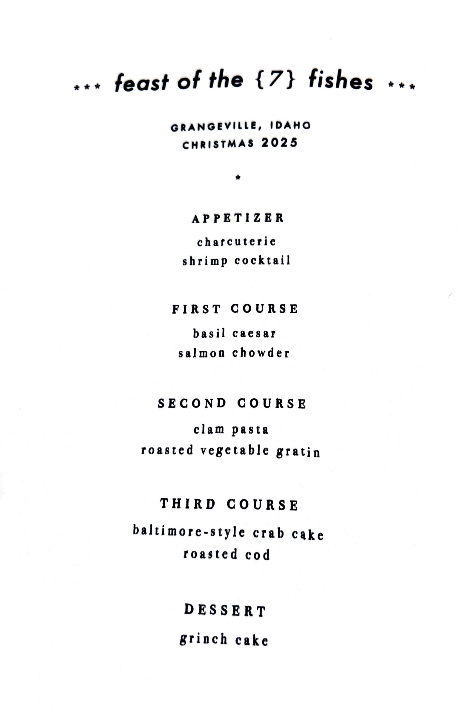 It was a full and fun house with most of the family able to make it home for Christmas. The prairie didn‘t offer a white Christmas but at least we could do a Christmas Eve hike to the nearby canyon without trudging through snow. Last year we had decided we wanted to do an Italian Feast of the Seven Fishes (hold the dried salt cod) even though we are neither Italian nor Catholic. Also, since Idaho is so close to the coast and known for its fresh and dizzying array of seafood options, it was our most practical menu choice. So, Christmas Eve was full of cooking in a nice kitchen! What a treat! (See full menu below and Em’s Grinch Cake Masterpiece). We watched It’s a Wonderful Life on a projector, as is tradition. We had a really fun Christmas Day with present opening, cookie and pasta making with the kids, and even a rendition of The Grinch Who Stole Christmas from Rory’s nieces!